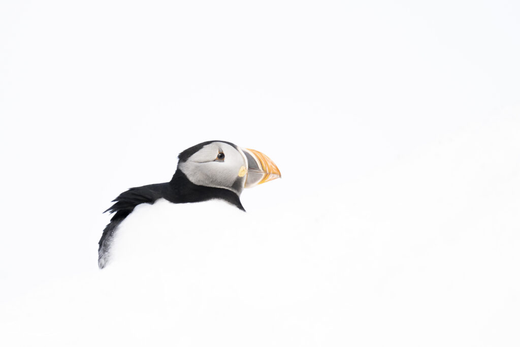 There we will work from floating hides to capture eiders and other seabirds at water level, navigate by zodiac to photograph birds in flight, and dedicate two full days to the spectacular seabird colony on the island of Hornøya.